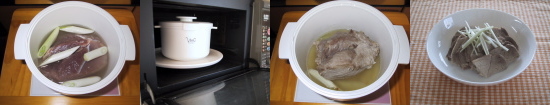 クック膳本体に豚肉、ねぎ、しょうが、にんんく、塩を入れ、電子レンジで7〜8分加熱します。