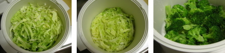 キャベツのせん切り(ぶつ切りでもOK)もクック膳の八文目まで入れ加熱すると半分以下の量になります。生のキャベツの千切りよりもたくさん食べる事ができますし、生野菜が苦手な子供もこれなら食べられるので助かっています。