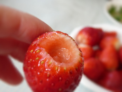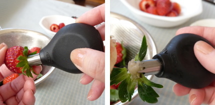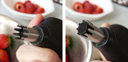 ヘタの部分にストロベリーハラーを差し込みます。 そのまま少しねじりながら芯をすくう感じで引き抜きます。 すると、ヘタと芯が一緒に抜けてくるのです。